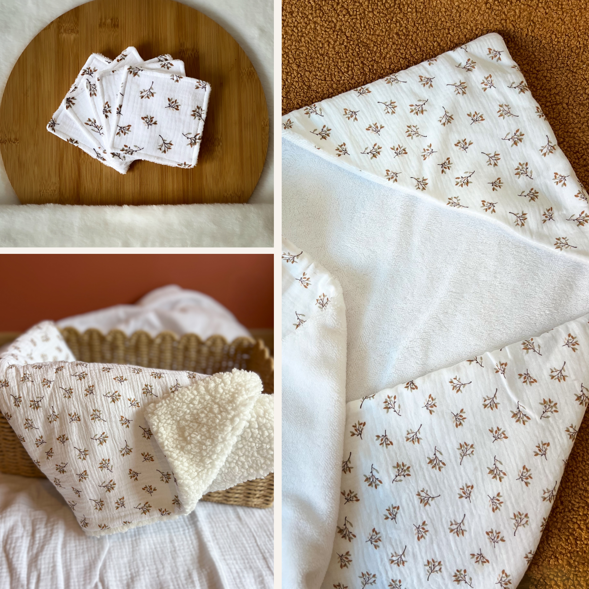 Les doublures en éponge de bambou et en sherpa sont soigneusement sélectionnées pour s’accorder parfaitement à la double gaze choisie, afin de créer un ensemble doux, élégant et harmonieux.