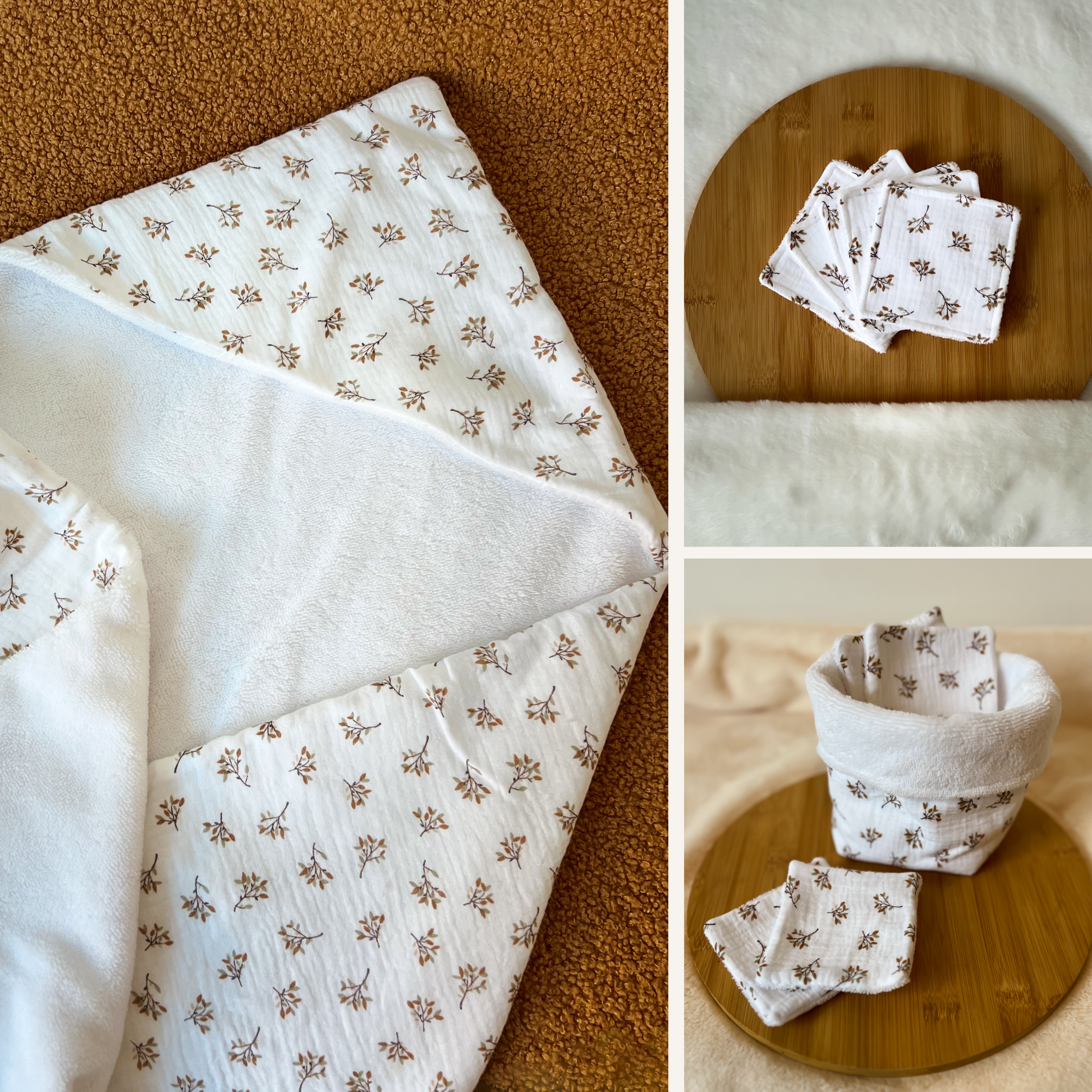 Découvrez notre coffret sortie de bain, idéal pour envelopper votre petit trésor à la sortie du bain, ce coffret allie confort et douceur pour des moments de tendresse.